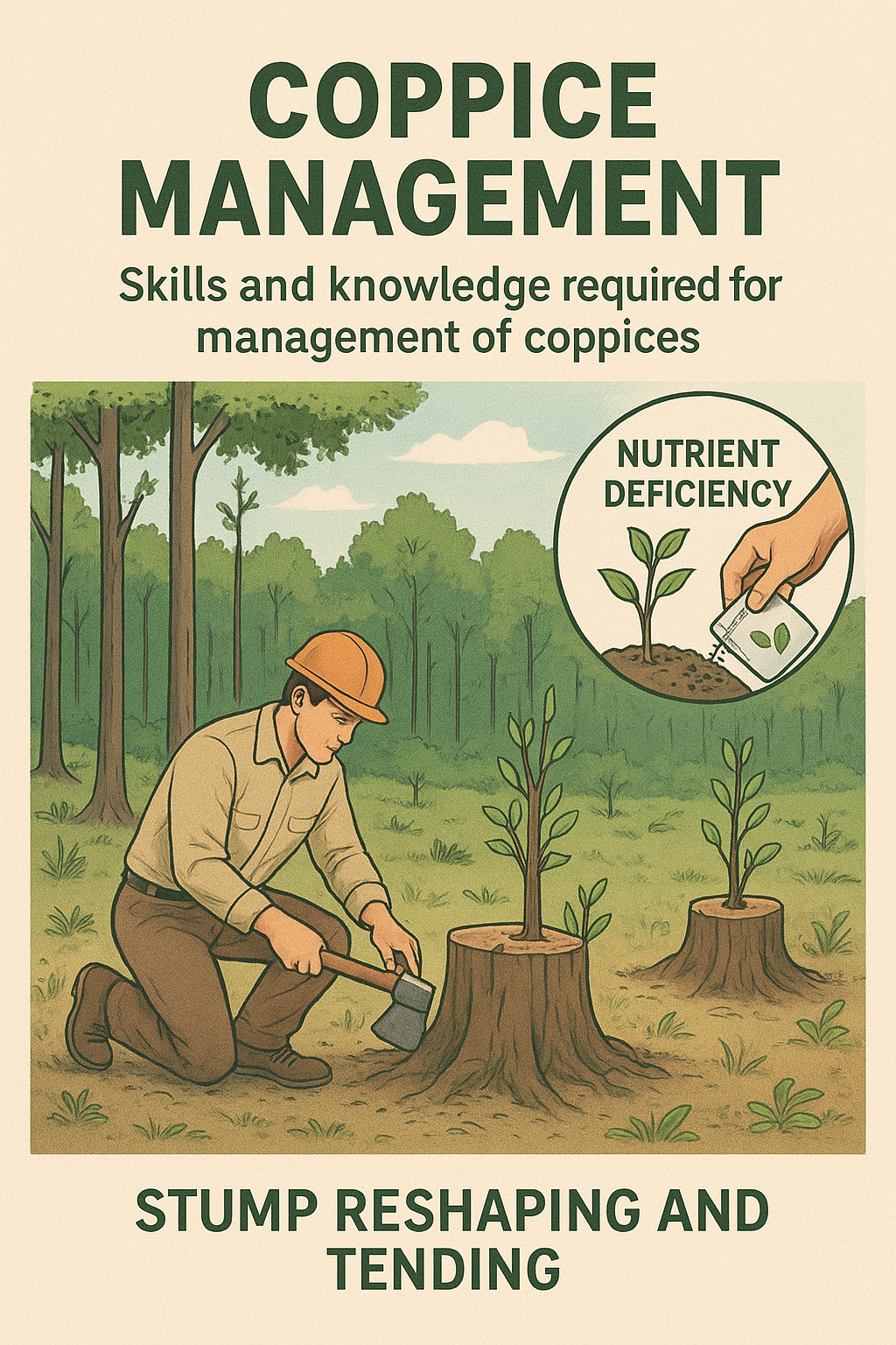 When a forest is harvested, coppices need to be managed so that they will sustain another flow of future forest. His module describes the skills and knowledge required to perform stump reshaping, tending operations, in order to get a sound forest made of high vigor coppices. again, this module will help learners to detect nutrients deficiency, and to decide whether coppices need fertilizers for better growth of sprouts.