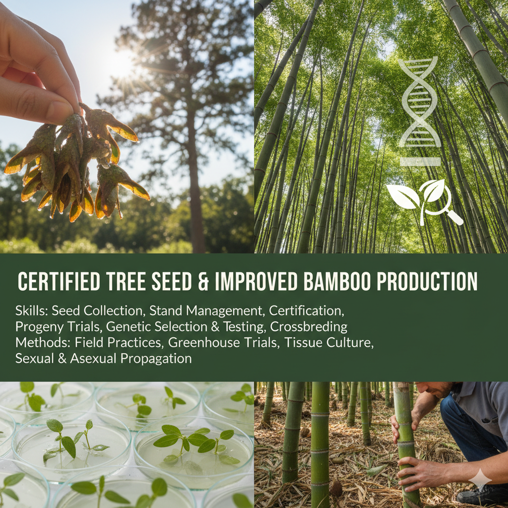 This module describes the skills, knowledge and attitude required to produce certified tree seed, improved tree, and bamboo production. It focuses on planning tree seed production flow, establishing tree seed stand, applying for tree seed certification, perform tree species and progeny trials, selection of genetic materials, perform crossbreeding, perform genetic testing and evaluation, and bamboo production. This will be achieved through field practices in collecting tree seeds using appropriate tools, monitoring the management practices of tree seeds stands, effective tree seed handling, carrying out different tests on tree seeds to ensure viability, tests from improved greenhouses, testing of different tree species, tissues culture for different species, and