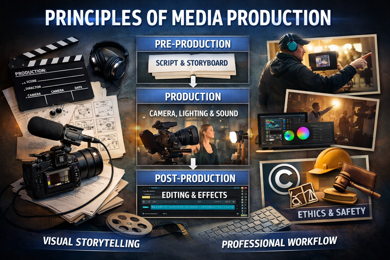 This module introduces learners to the foundational principles and practices of media production across film, television, radio, and digital platforms. It provides an overview of how media content is planned, produced, and delivered, emphasizing both creative and technical processes involved in professional media work.