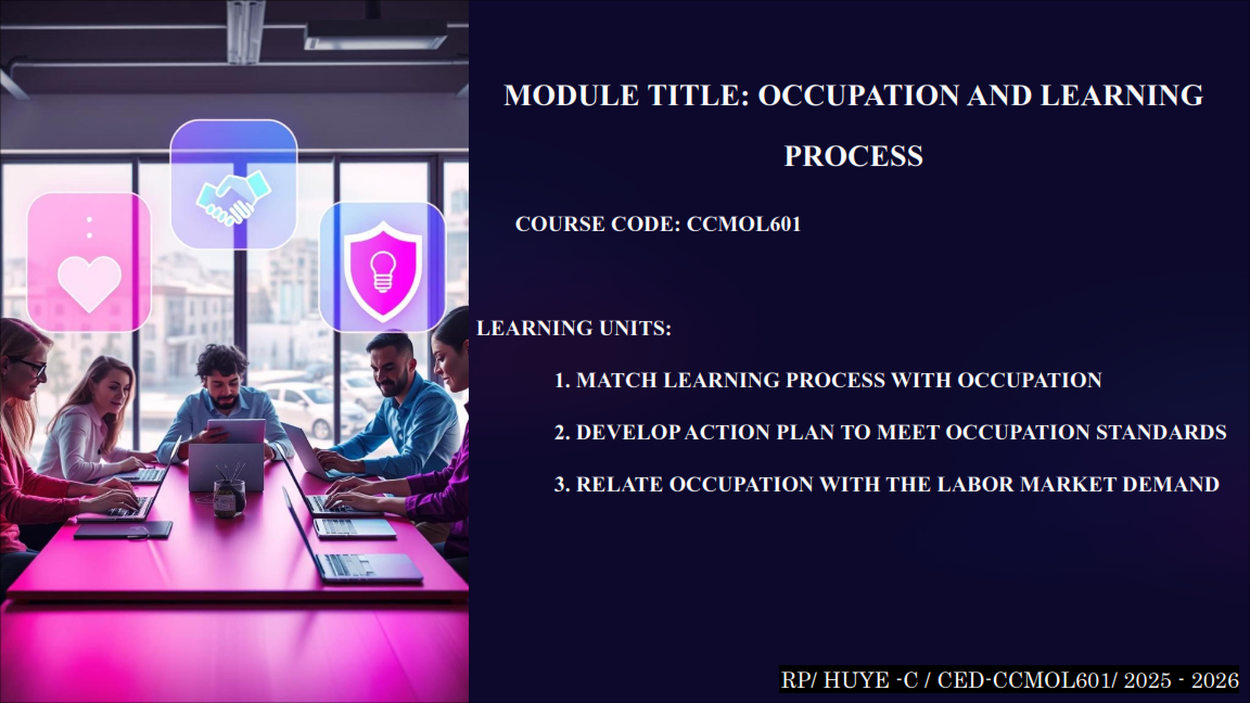 This module focuses on building the necessary skills, knowledge, and attitudes for aligning the learning process with a specific occupation. It guides trainees in creating action plans to meet professional standards and in understanding how their chosen occupation fits within the labor market.