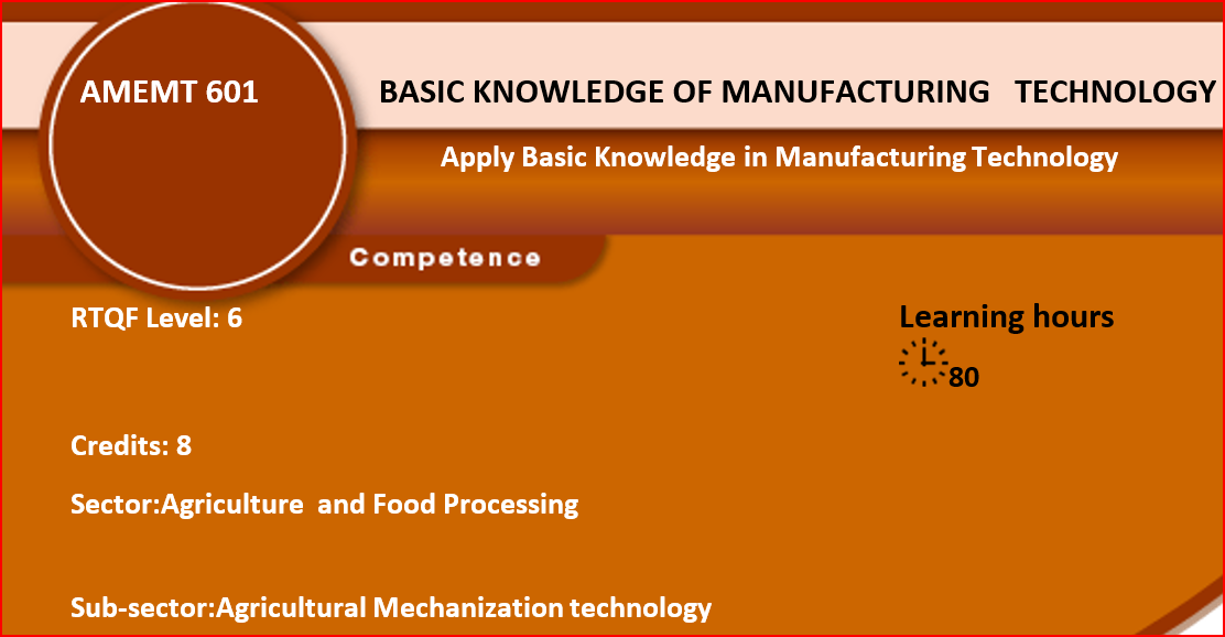 This module describes the skills, knowledge and attitude required to basic knowledge in manufacturing technology. This module is intended to students pursuing diploma in Agricultural Mechanization to organize the manufacturing workshop, conduct basic manufacturing processes, Conduct post activities of manufacturing processes. At the end of this module, the students will be able to Prepare the workshop,Identify tools, materials and equipment ,Select tools, materials and equipment for manufacturing processes ,Interpret drawings,Perform metal cutting, welding, drilling and milling processes, Perform melting, casting and forging processes, Perform carpentry process,Inspect manufactured products,Conduct cleaning of tools, equipment and workplace,Dispose wastes and scraps, Keep records of manufactured products