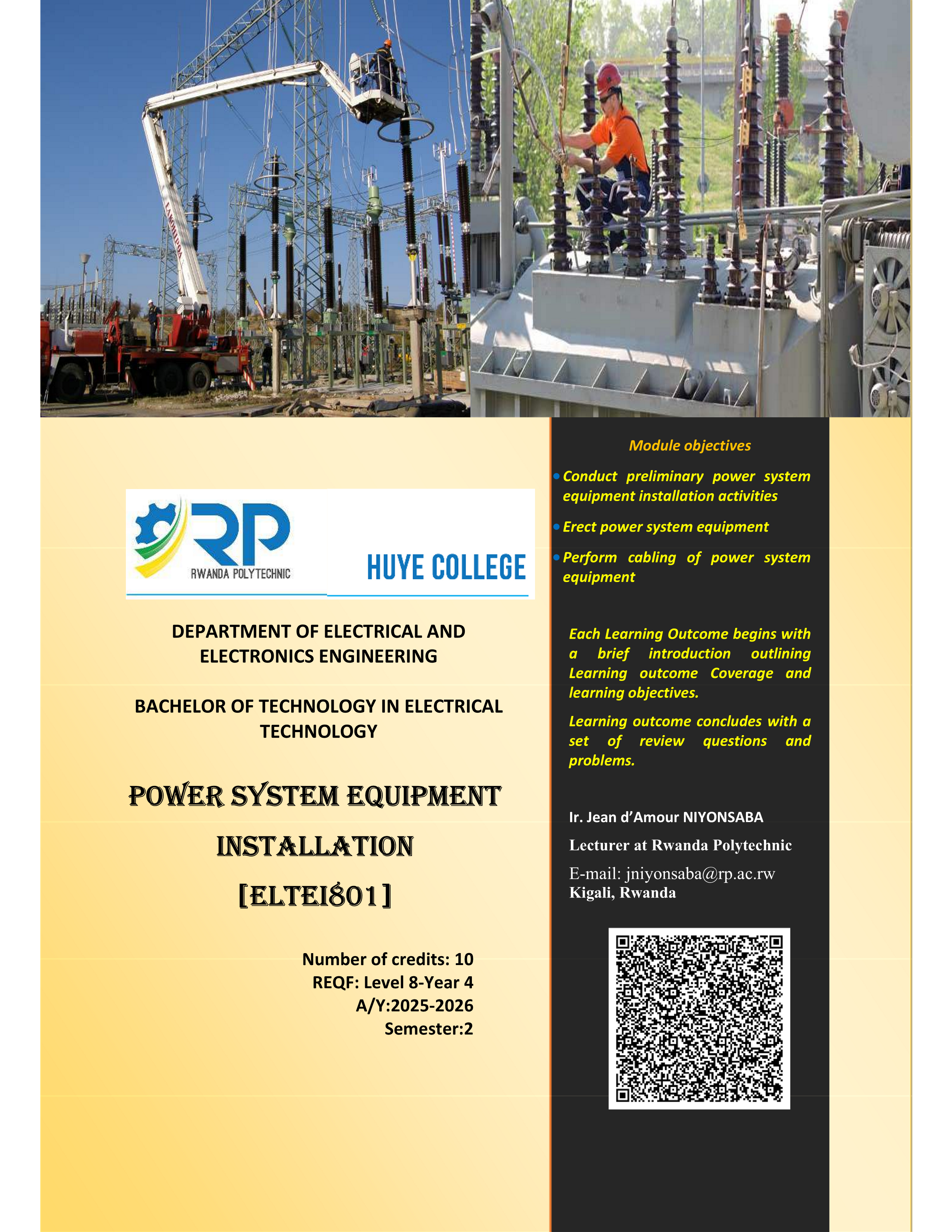 By the end of this module, learners enrolled in the Bachelor of Technology (BTech) in Electrical Technology will be able to interpret installation drawings, prepare and inspect installation sites, assemble and install major power system equipment, and complete associated wiring, grounding, and cabling tasks to a professional and operationally reliable standard.