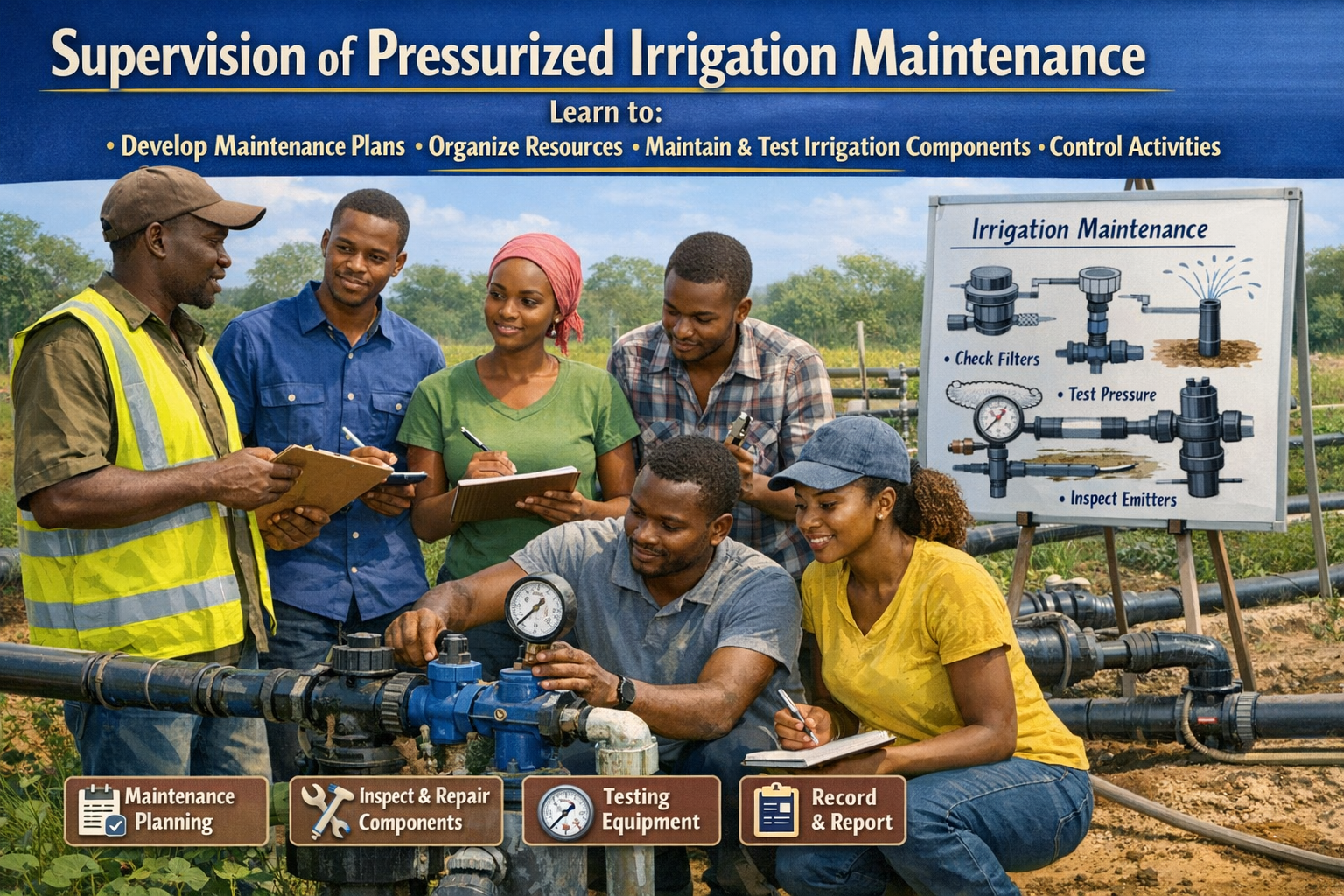This module describes the skills, knowledge, and attitude required to supervise pressurized irrigation maintenance. It is intended for learners pursuing a TVET diploma of irrigation and drainage technology. At the end of this module the students will be able to develop a maintenance plan for a pressurized irrigation system, organize resources, carry out maintenance of irrigation components and testing equipment, control maintenance activities for pressurized irrigation components, and complete records and reports of irrigation system maintenance. A qualified student deemed competent to this competency may work with others in support of current professional practice in marshland, hillside, small-scale irrigation, gardens, and greenhouses under guidance.