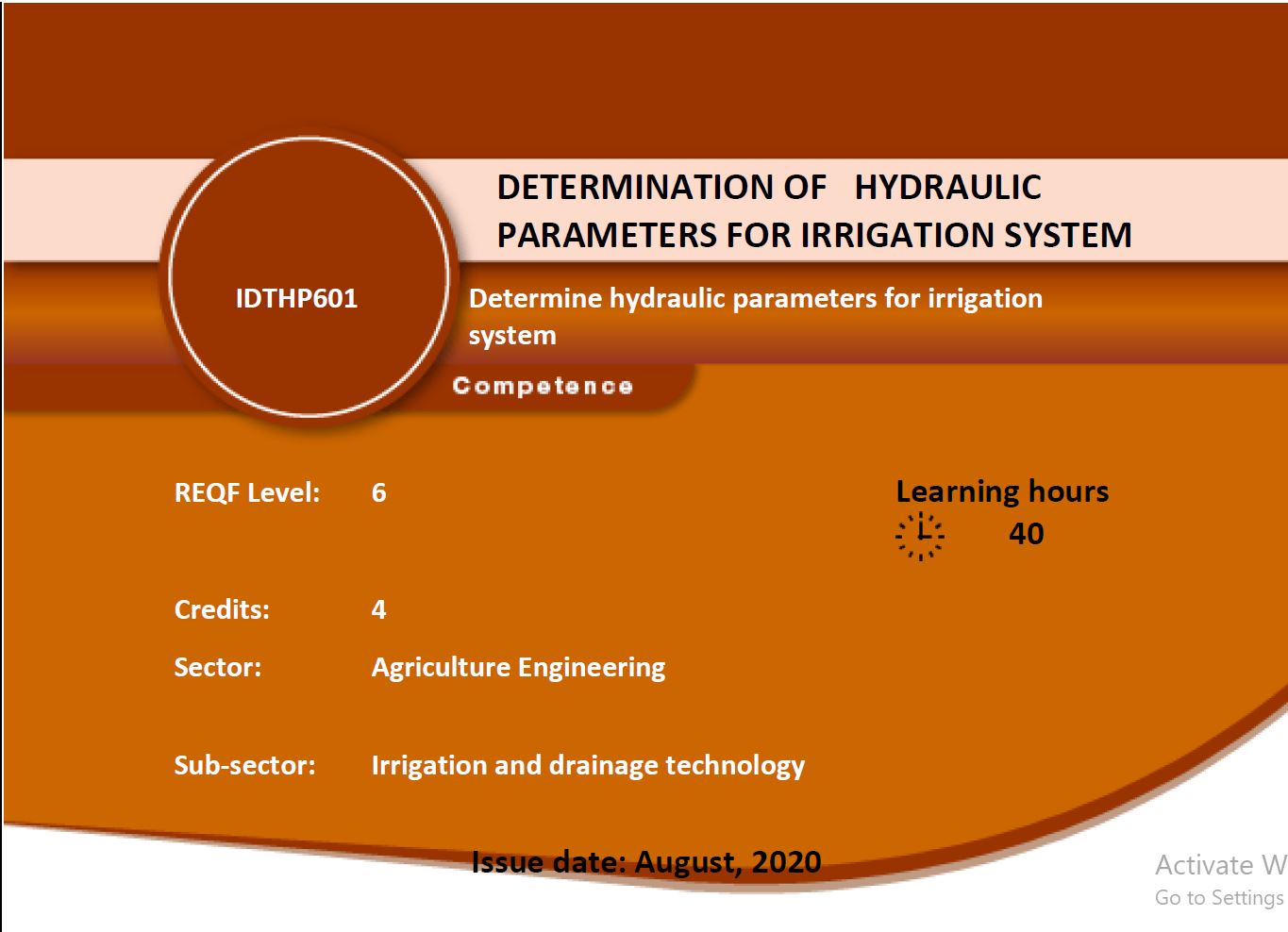 This module describes the skills, knowledge and attitude required to determine hydraulic parameters for irrigation system. It is intended for learners pursuing TVET diploma of irrigation and drainage technology. At the end of this module the students will be able to confirm water delivery specifications for irrigation system, determine pressures required to deliver required amount of water over specified area and select system components to deliver water efficiently. Qualified student deemed competent to this competency, may work with others in support of current professional practice in marshland, hillside, small scale irrigation, garden, greenhouses under guidance