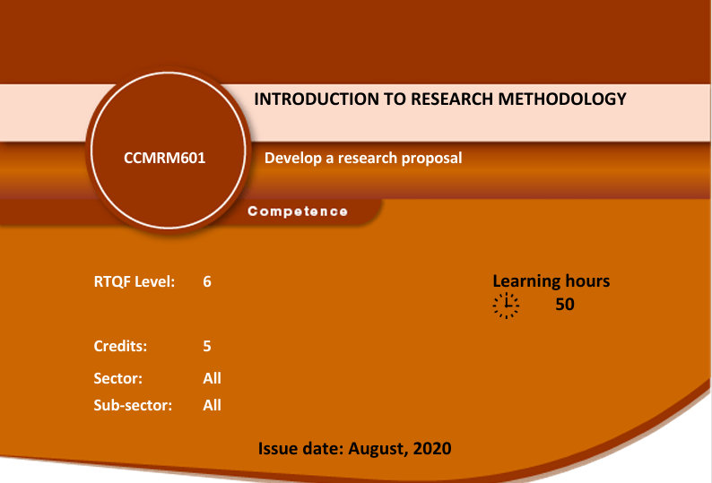 This module aims to equip the student in the TVET related trades acquiring essential knowledge, skills, values and attitudes in the comprehensive research methodology. The emphasis will be put on description of research concept, development and presentation of research proposal. This module provides the ability to conduct a research proposal.