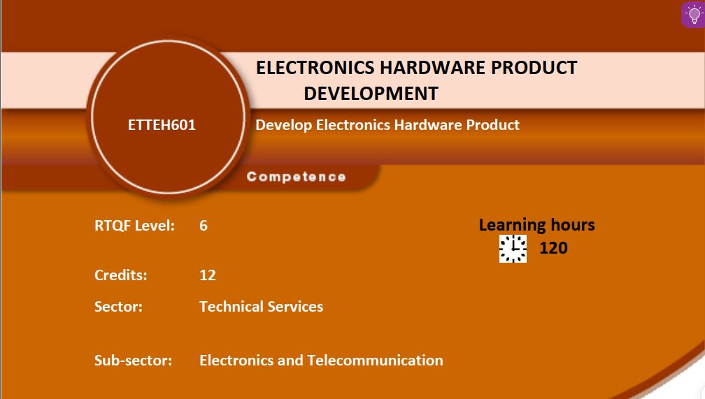 It is an obligation for each trainee in electronic and telecommunication to develop an electronic hardware product in case is demanded by a customer and need to replace a defective product. The trainees will be familiar with development of electronic hardware product.